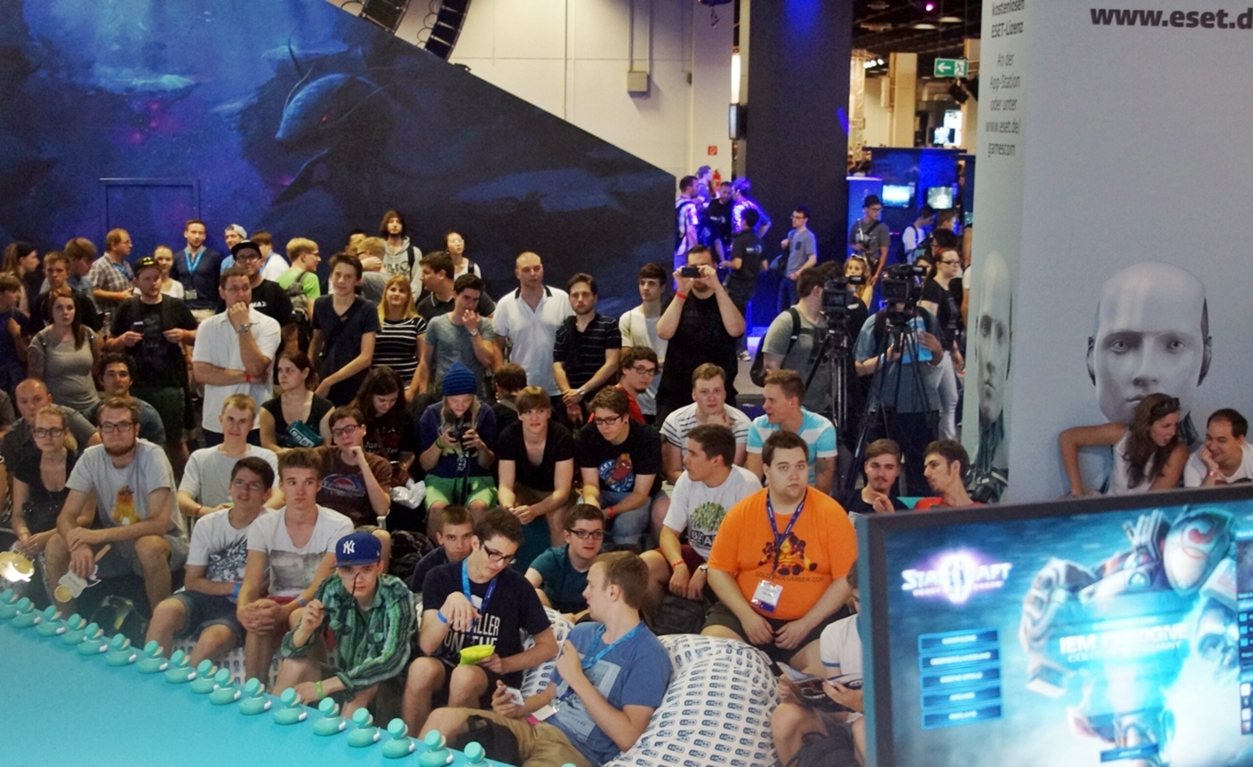 Um halb acht begann schon wieder der nächste Tag für uns. Wir genossen die leeren Hallen der gamescom, machten uns aber schon auf den Ansturm bereit. Mit einer Tasse Kaffee in der linken und meiner Kamera in der rechten Hand machte ich mich dann gegen 10 Uhr auf den Weg zum ESET Stand. Dort saß sogar schon Budi, um sich warm zu machen. Die Niederlage des gestrigen Tages wollte er nicht auf sich sitzen lassen! Aber natürlich kam er auch mal von der Bühne runter, um sich Zeit für seine Fans zu nehmen. Auch die funkelnden Augen der begeisterten Fans, die das erste Mal auf Budi trafen, ließen fast ein bisschen mein Herz aufgehen.