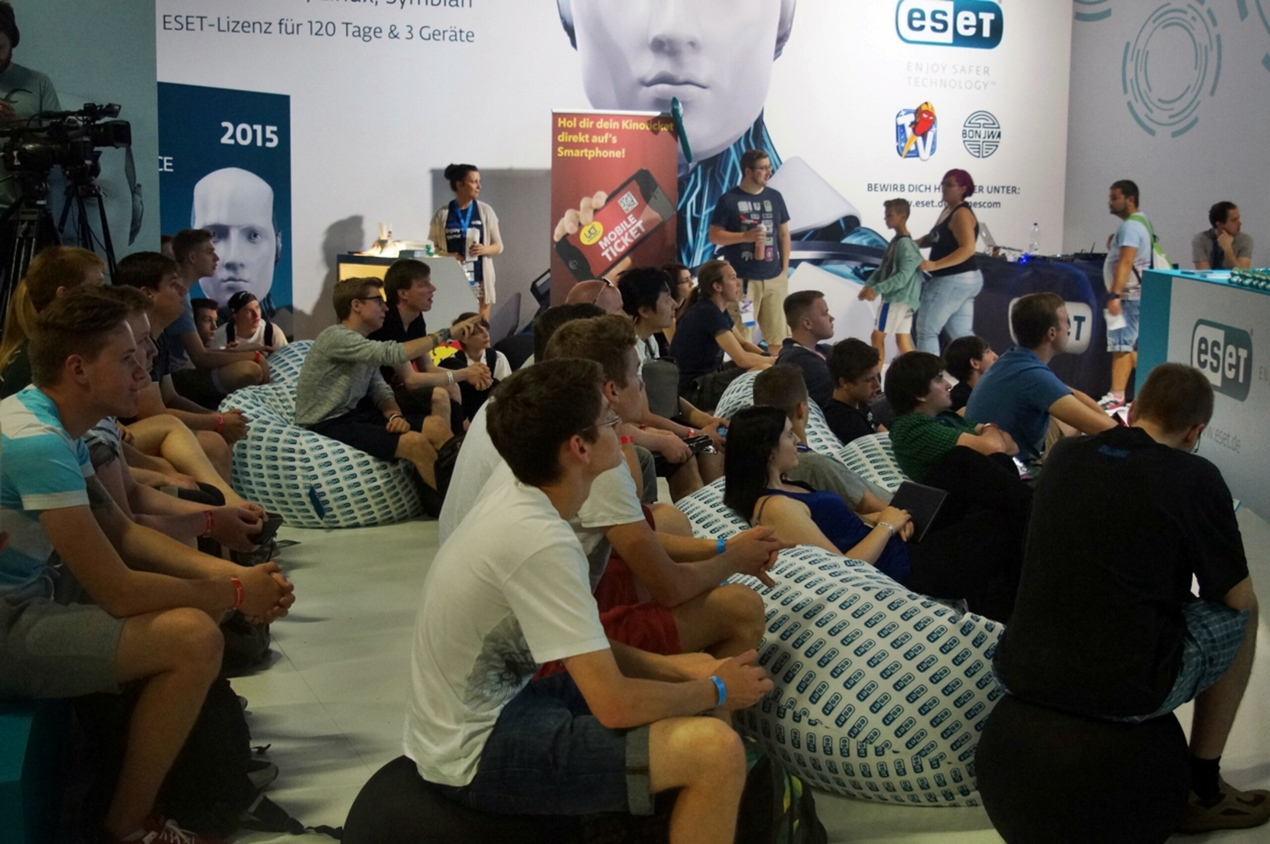 Leicht müde und vielleicht auch ein bisschen verkatert starteten wir direkt in den nächsten Tag. Nach einem Kaffee , trafen wir uns wieder pünktlich um 10 Uhr am ESET Stand. Dort sah man sogar einige bekannte Gesichter wieder. Unter anderem LimeGreen und Pubcracker aus der Bonjwa Community, diese spielten nämlich bei Call of Budi mit. Danach kamen wir schon in den gewöhnlichen Gamescom-Trott. Pünktlich um 11 Uhr startete unser Programm auf der ESET Bühne. Diesmal bekamen wir auch wieder Merch von den Rocket Beans gestellt und hatten somit das beste Zeug , um euch glücklich zu machen - vor allem die Plüschbohnen kamen gut an. Die Stimmung war wie immer ausgelassen und alle verfolgten gespannt das Turnier.